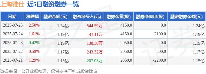 上海雅仕融资融券信息显示,融资方面,当日融资买入1144.64万元,融资偿还600.05万元,融资净买入544.59万元,连续3日净买入累计724.0万元。融券方面,融券卖出0.0股,融券偿还0.0股,融券余量4150.0股,融券余额5.1万元。融资融券余额1.24亿元。